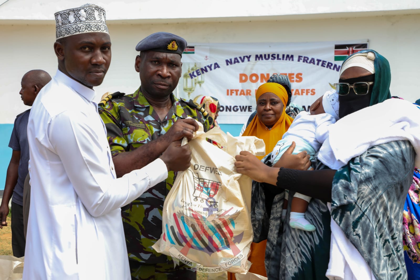 On behalf of Defence Headquarters Principal Imam Colonel (Imam) Abdulmalik Rubeya, Kenya Navy Service Imam, Lieutenant Colonel (Imam) Salim Mwarora, on 27 February 2026, in a gesture of goodwill during the holy month of Ramadan donated assorted food items to the Muslim community at Mtongwe, Mombasa.