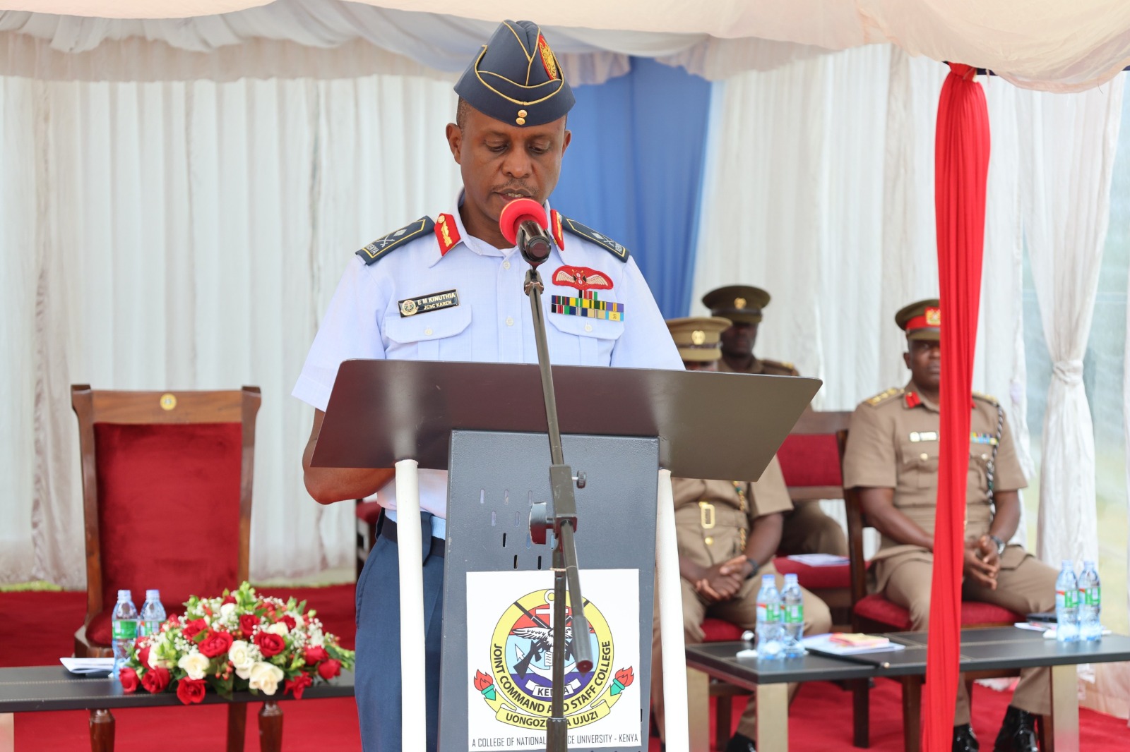 On Thursday 11 December 2025, the Commandant of the Joint Command and Staff College (JCSC), Major General Eric Kinuthia, presided over the graduation ceremony of the Junior Joint Command and Staff Course, JJCSC 102/25 at the JCSC Karen. The Commandant was accompanied by Colonel Peter Karigih, the Colonel Coordination, Colonel Benjamin Kiprop, the Head of Writing Team, Colonel Amani Kotea, the Head of Teaching Team and Lieutenant Colonel Moses Muchemi, the Head of Junior Division.
