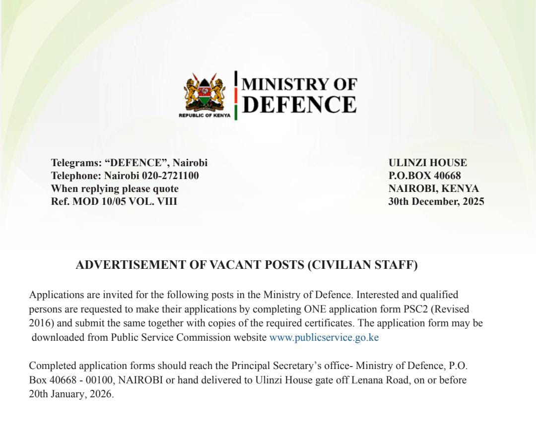 Completed application forms should reach the Principal Secretary’s office- Ministry of Defence, P.O. Box 40668 – 00100, NAIROBI or hand delivered to Ulinzi House gate off Lenana Road, on or before 20th January, 2026