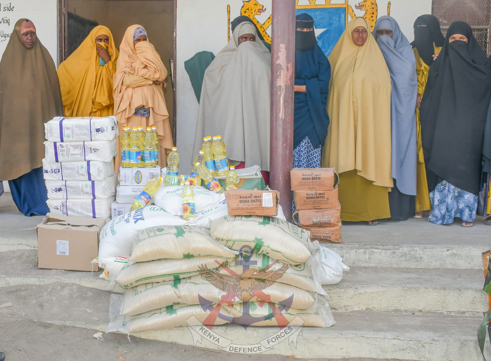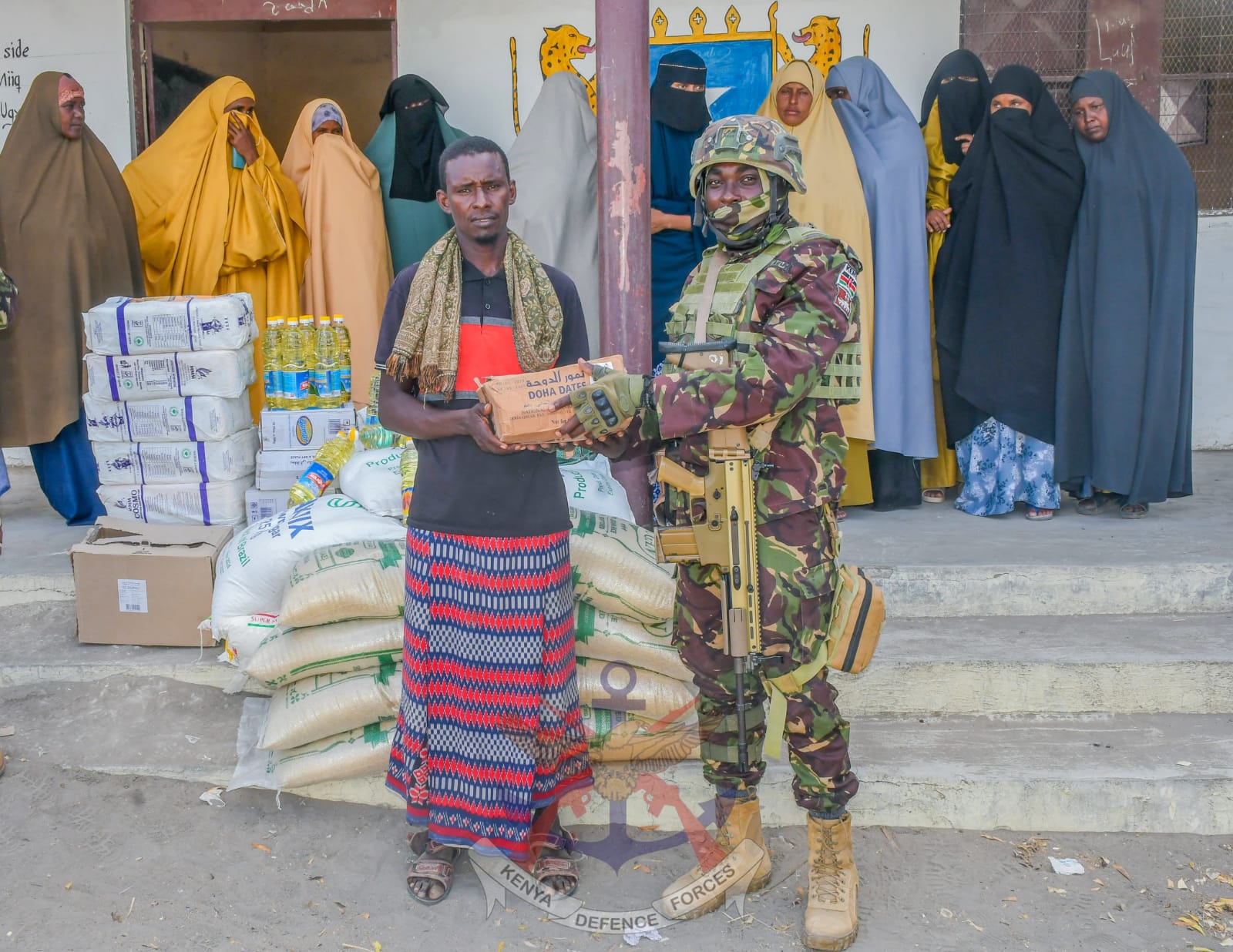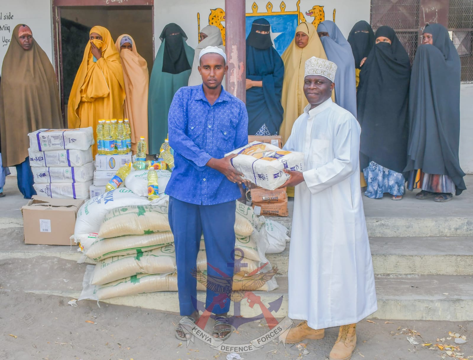 In the spirit of the holy month of Ramadan, KDF troops donated assorted food items to members of the local Muslim community at Al Hikma Afmadhow Primary School. The food packages included essential supplies intended to support families during the fasting period.