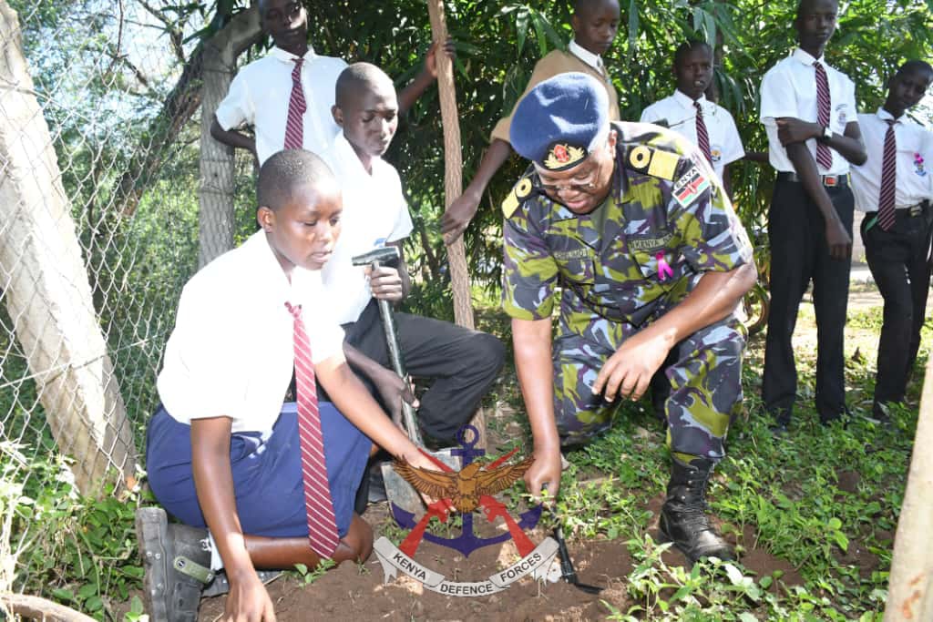 At Marigat Integrated Day Secondary School in Baringo County, staff from the National Defence University–Kenya (NDU–K), in collaboration with Operation Maliza Uhalifu (OMU) troops, the National Police Service (NPS), and members of the local community, planted more than 3,500 assorted tree seedlings within the school compound.