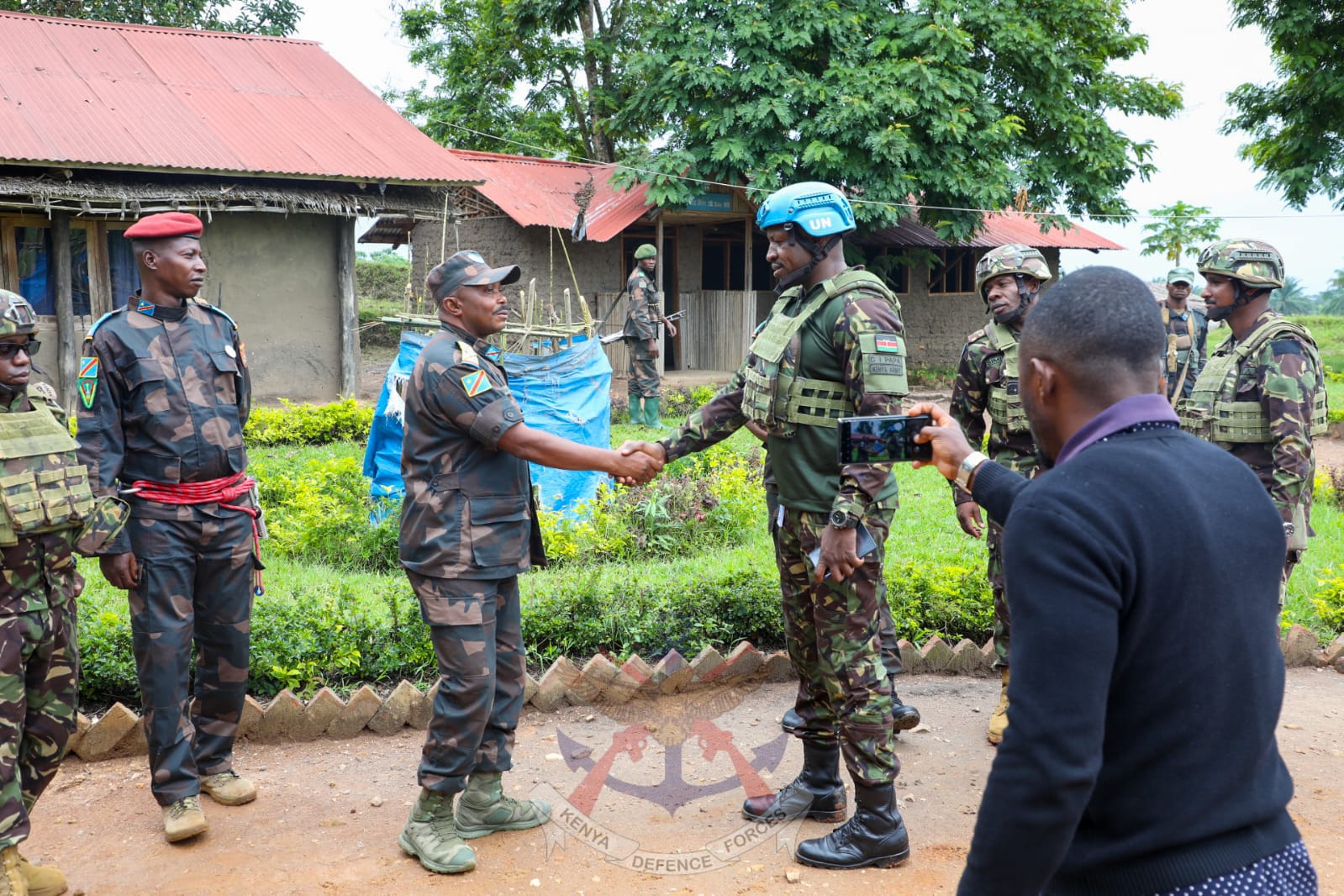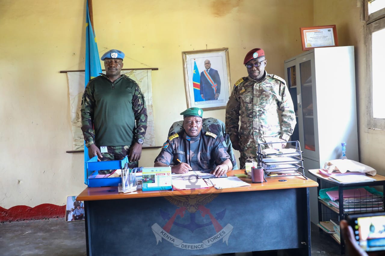 Lieutenant Colonel Celestine Papa, the Commander of Kenya’s 5th Quick Reaction Force (KENQRF 5), deployed under the United Nations Organization Stabilization Mission in the Democratic Republic of the Congo (MONUSCO), recently conducted a Key Leadership Engagement (KLE) in Oicha, Beni Territory. Lt Col Papa a paid courtesy calls on Colonel Shere Omeonga, the Administrator of Beni Territory, and Colonel Victor Mpyana, Commander of the Congolese Armed Forces’ (FARDC) 32 Rapid Reaction Brigade, both stationed in Oicha.