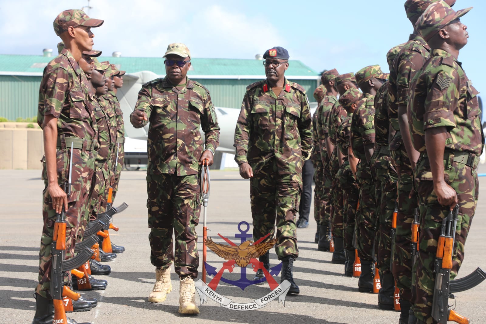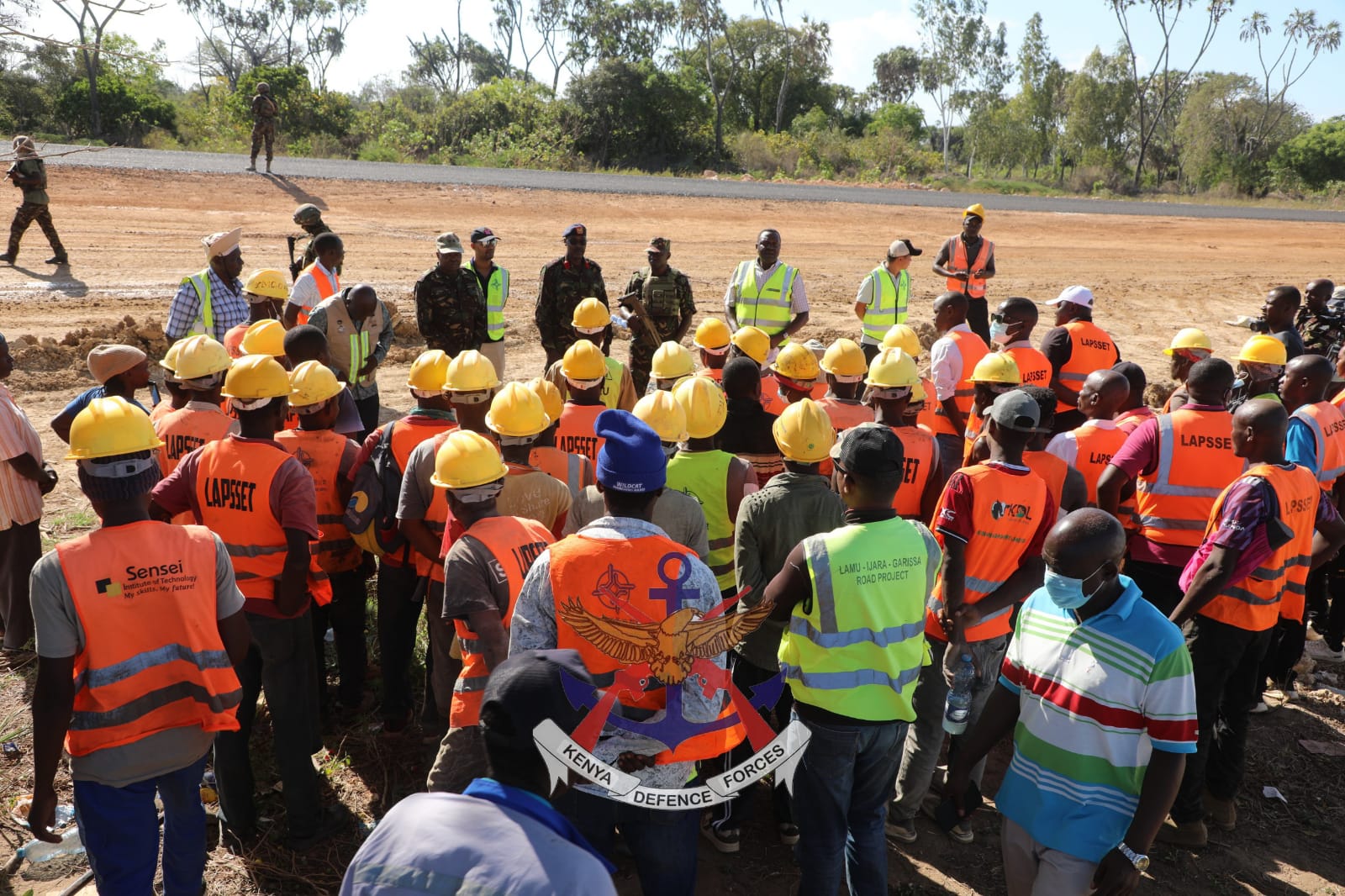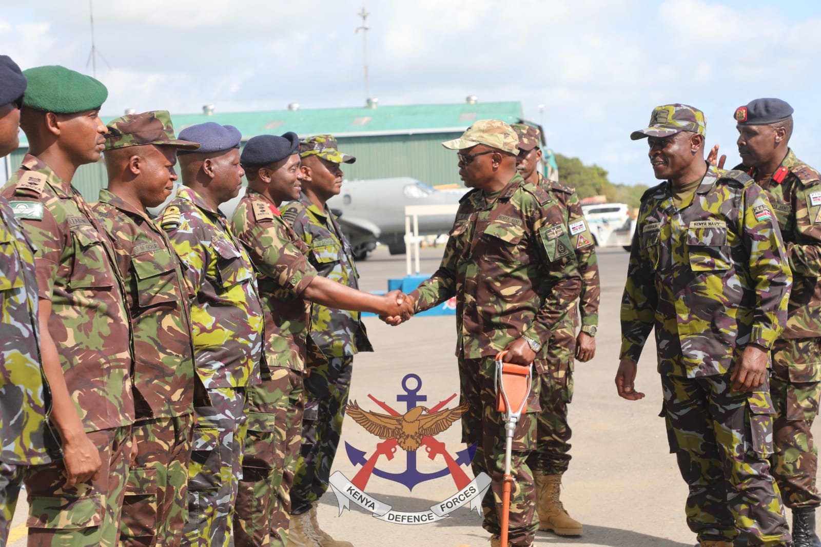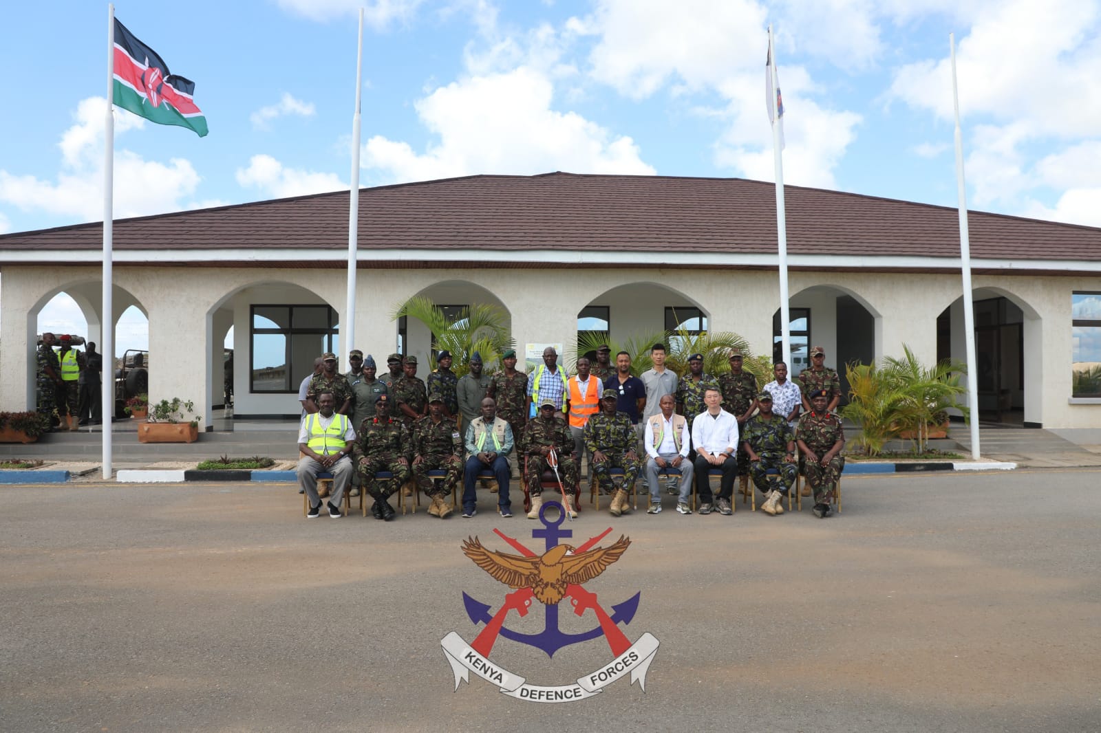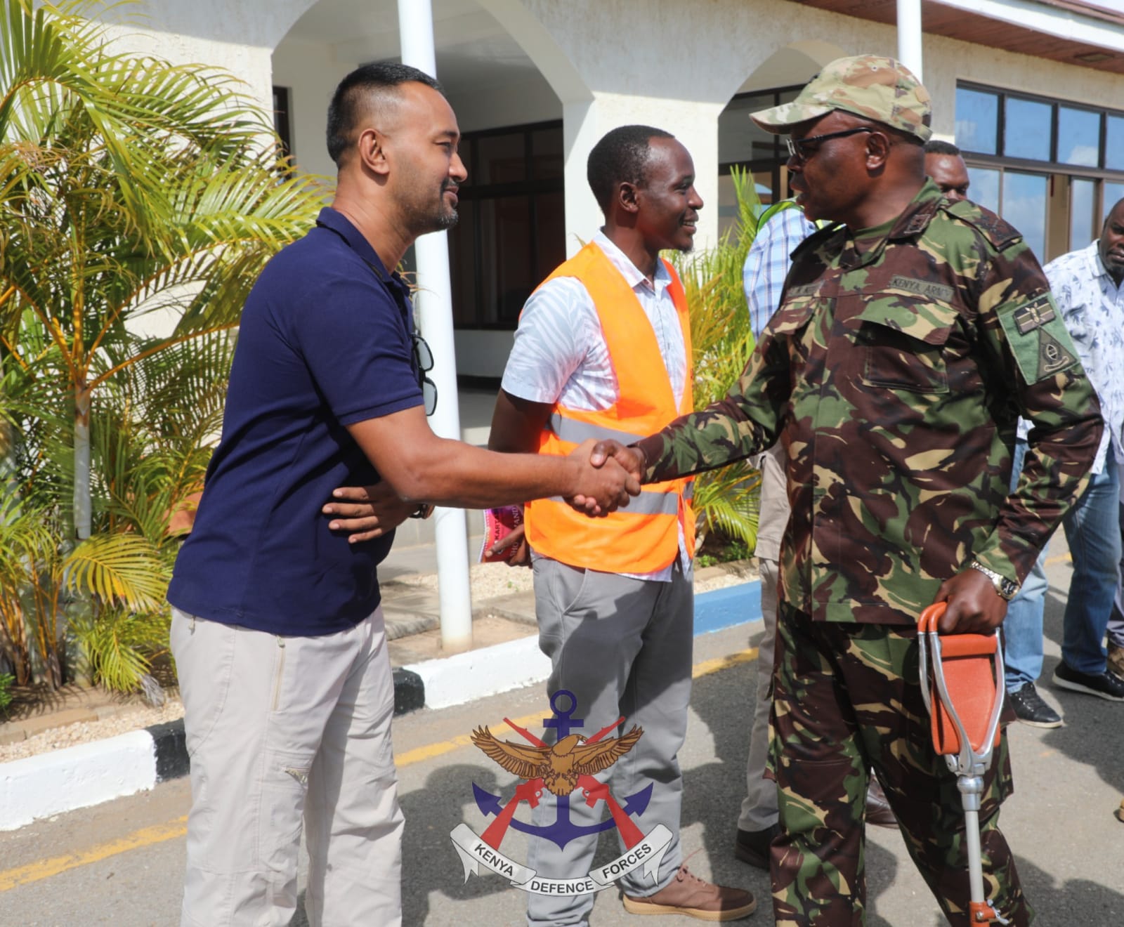 Maj. Gen. Kutto, accompanied by the Director General of the Kenya National Highways Authority (KeNHA), Eng. Luka Kimeli and Mr Wang Lening (Project Manager, China Communication Construction Company Limited) were received at Kenya Navy Base (KNB) Manda Bay by the Base Commander, Brigadier Lazarus Wafula and Commander 6 Brigade Brigadier Meshack Kishoyian.