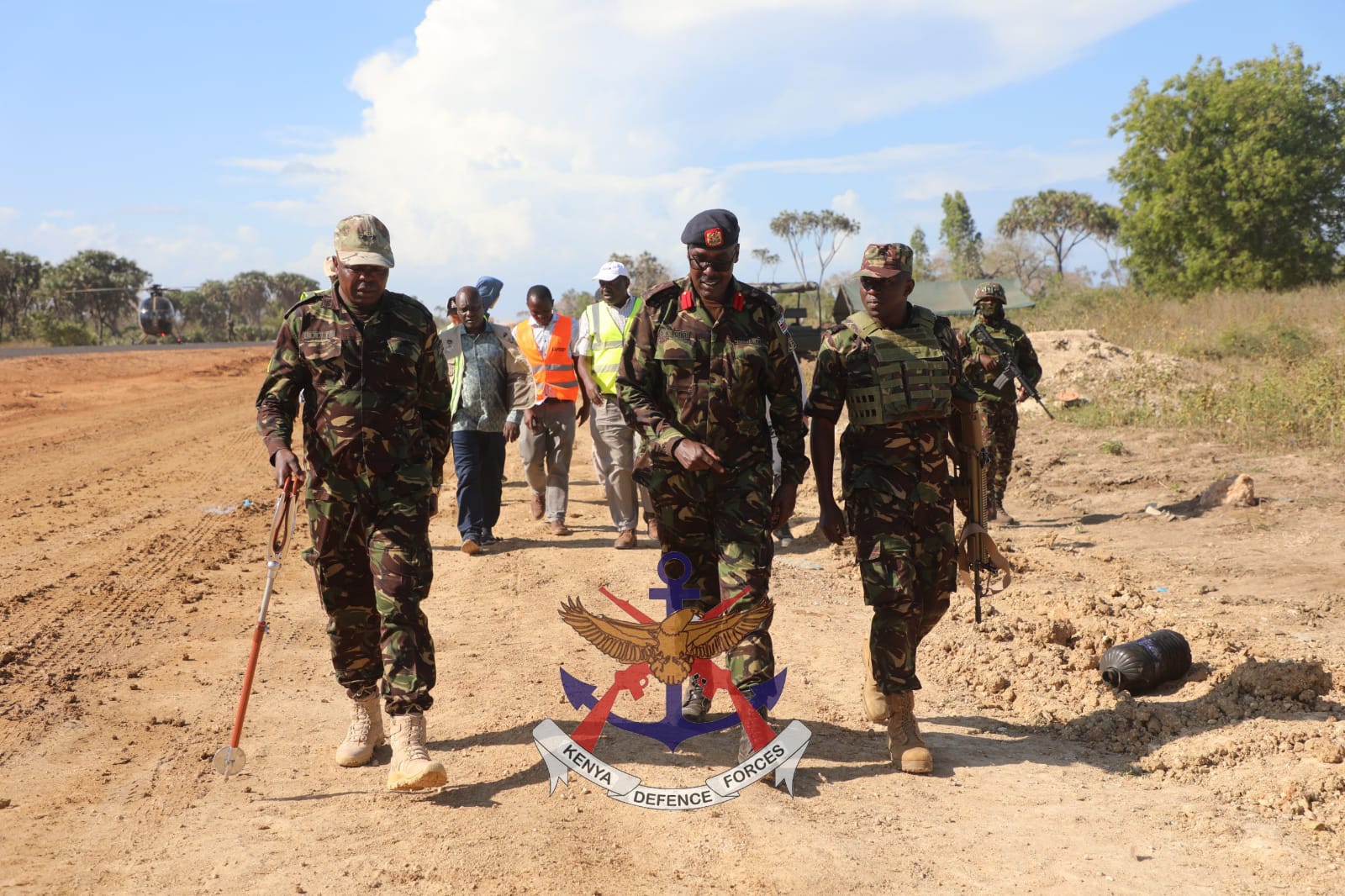 Maj. Gen. Kutto, accompanied by the Director General of the Kenya National Highways Authority (KeNHA), Eng. Luka Kimeli and Mr Wang Lening (Project Manager, China Communication Construction Company Limited) were received at Kenya Navy Base (KNB) Manda Bay by the Base Commander, Brigadier Lazarus Wafula and Commander 6 Brigade Brigadier Meshack Kishoyian.
