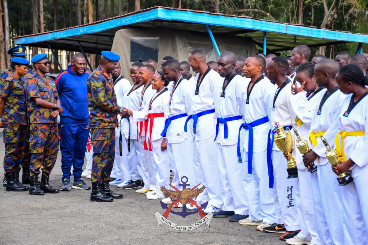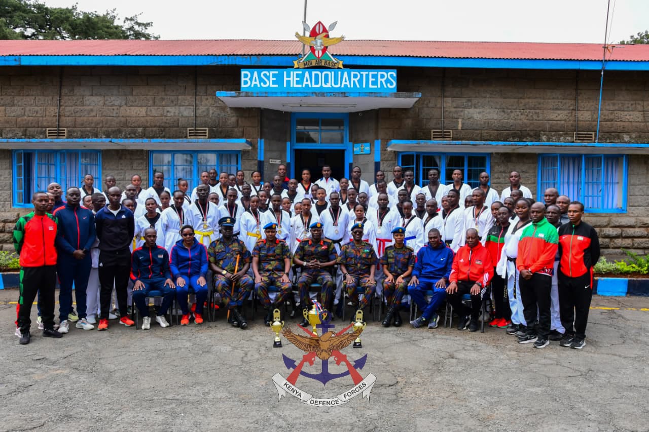 Base Commander Moi Air Base, Brigadier Herbert Wafula, who also chairs the Defence Forces Taekwondo Association, recently received the Nakuru Open Taekwondo League Championship trophy from the KDF Ulinzi Taekwondo team at Moi Air Base Headquarters, Nairobi.