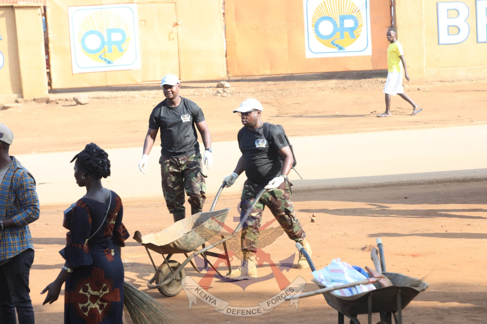 Kenyan peacekeepers from the 5th Quick Reaction Force (KENQRF 5), deployed under the United Nations Organization Stabilization Mission in the Democratic Republic of the Congo (MONUSCO), joined hundreds of residents of Beni this morning for the weekly community clean-up initiative dubbed “Exercise Safisha Mji” (Clean the Town), locally known as “Salongo.”