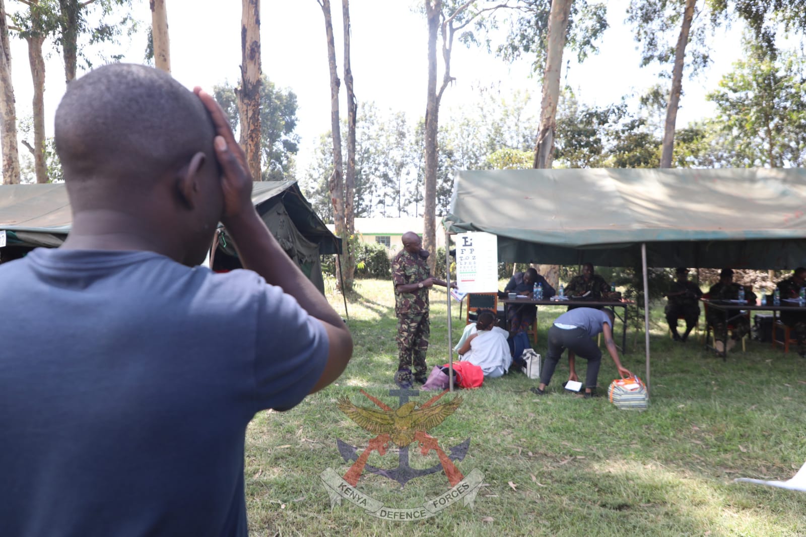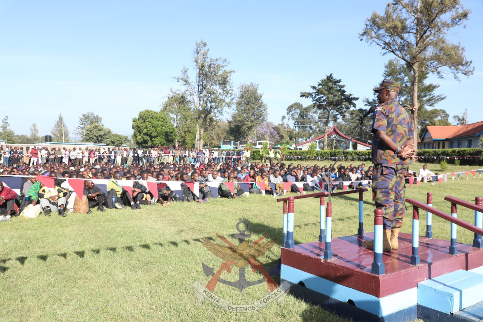 The Chief Recruitment Officer, (CRO) Brigadier Samuel Kimani received the shortlisted General Service Officers (GSO) graduate candidates at Lanet as part of the ongoing nationwide Kenya Defence Forces (KDF) recruitment drive.