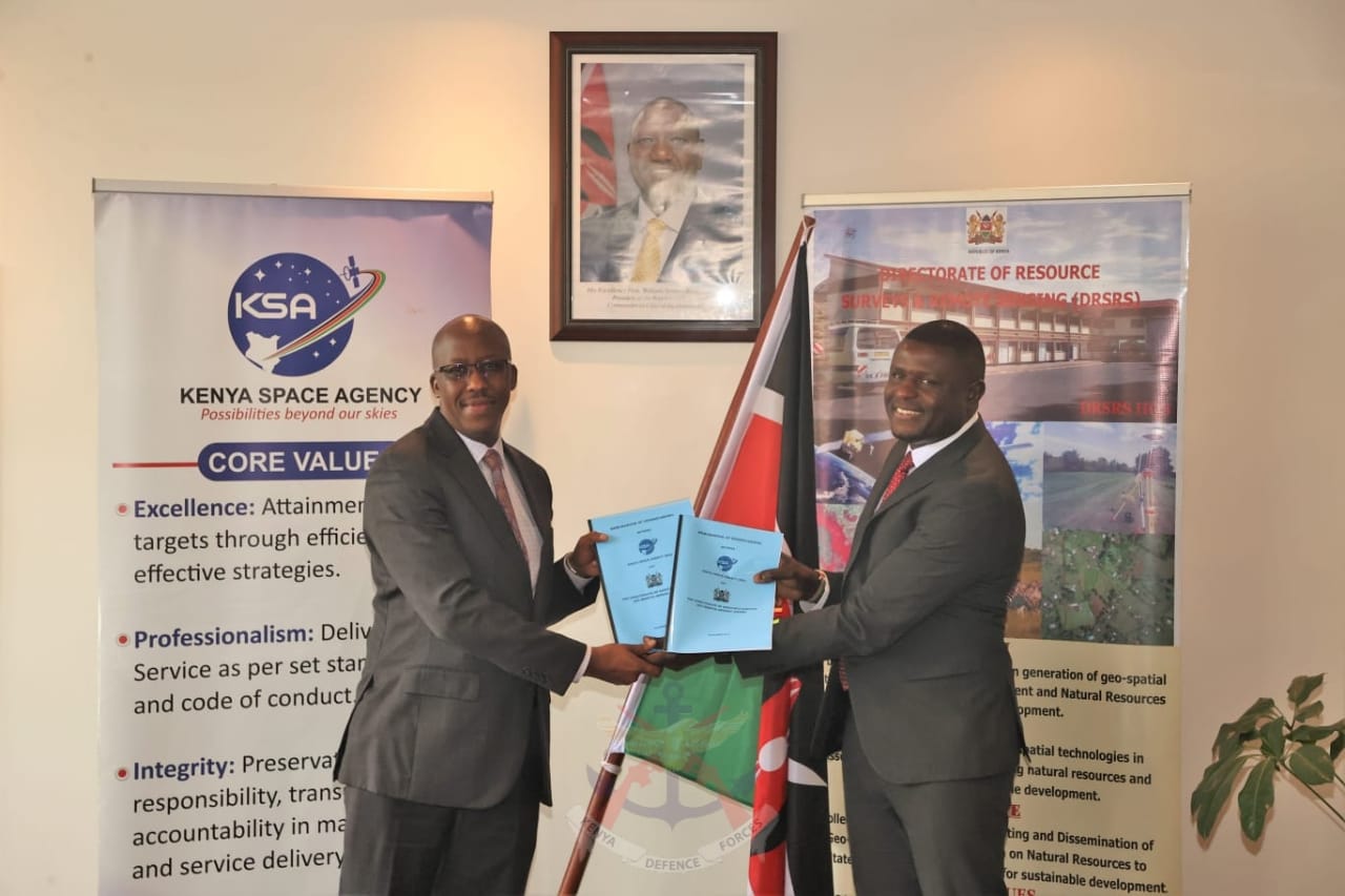 The Kenya Space Agency (KSA) has today, Tuesday 29 November 2022, signed a Memorandum of Understanding (MoU) with the Directorate of Resource Surveys and Remote Sensing (DRSRS) that will see the two entities partner in an array of thematic areas. Key among the areas of collaboration include natural resource management, disaster response and mitigation, environmental monitoring, agriculture and food security, climate change, mining and geology as well as monitoring the blue economy.
