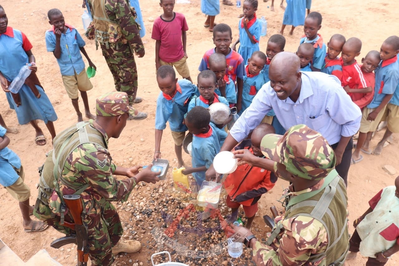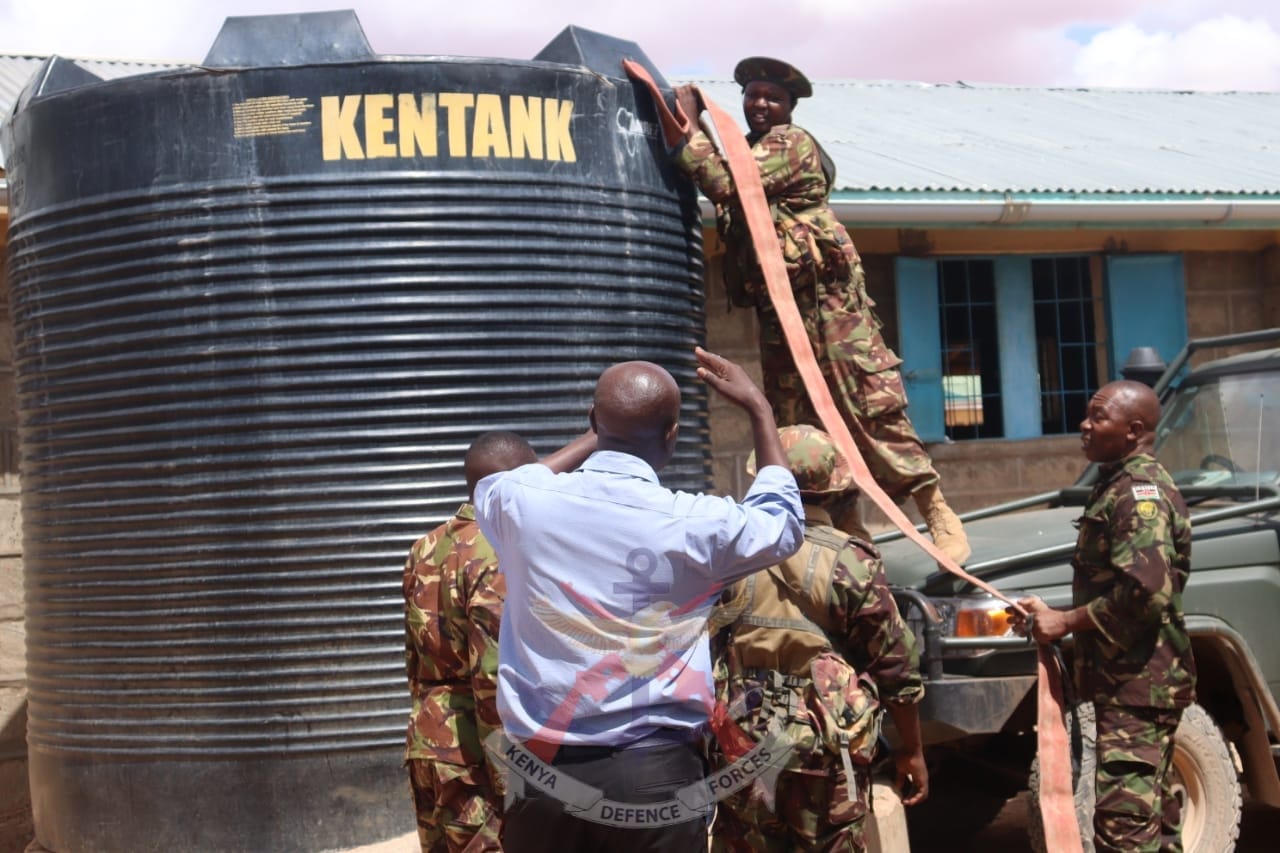 In the midst of hard hitting drought in Samburu County, Kenya Defence Forces (KDF) troops on advanced training in preparation for Africa Transition Mission in Somalia (ATMIS), conducted a Civil Military Cooperation (CIMIC) on 10th Nov 2022, where they provided 20,000 litres of water to Laresoro Primary School, to cater for Grade 3,4 and 5 pupils who are currently sitting for their one week KNEC CBC exams.