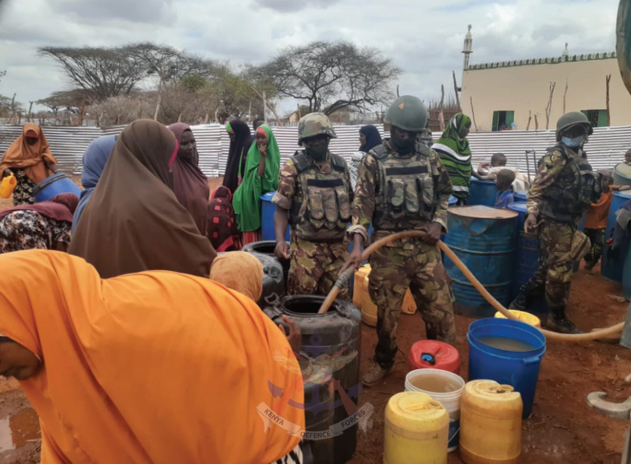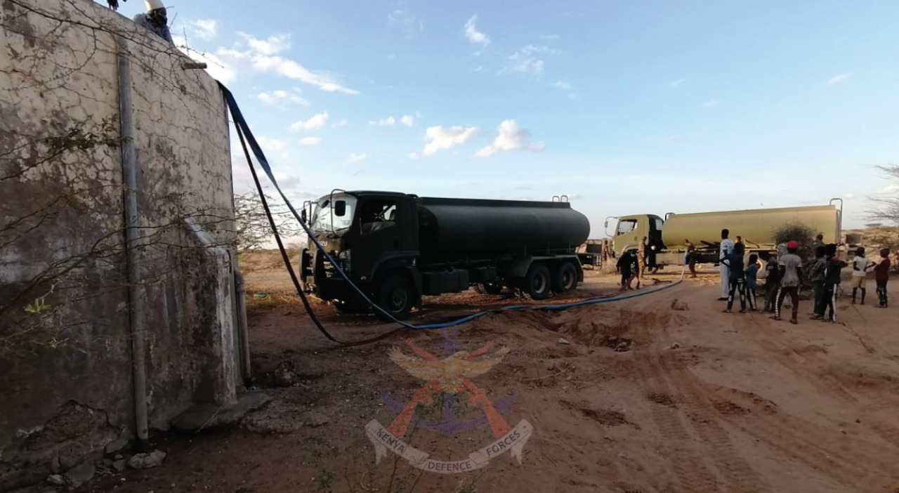 Kenya Army personnel from 7, 15 and 19 Kenya Rifle Battalions as well as 86 Armoured Reconnaissance Battalion and the 78 Tank Battalion on 18th August 2021 conveyed and distributed 100,000 litres of water to residents of Modogashe, Elwak, Mandera, Damasa, Gheriile and Dadajabula.